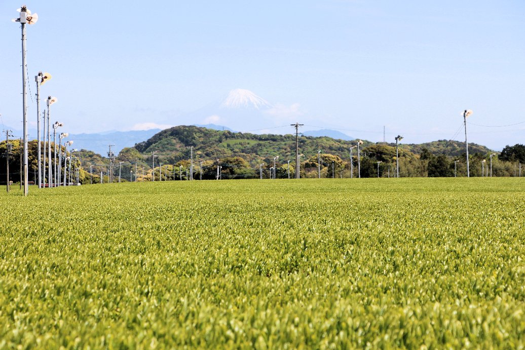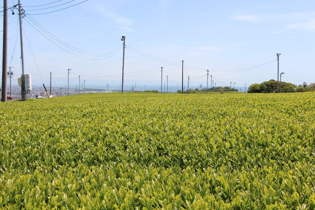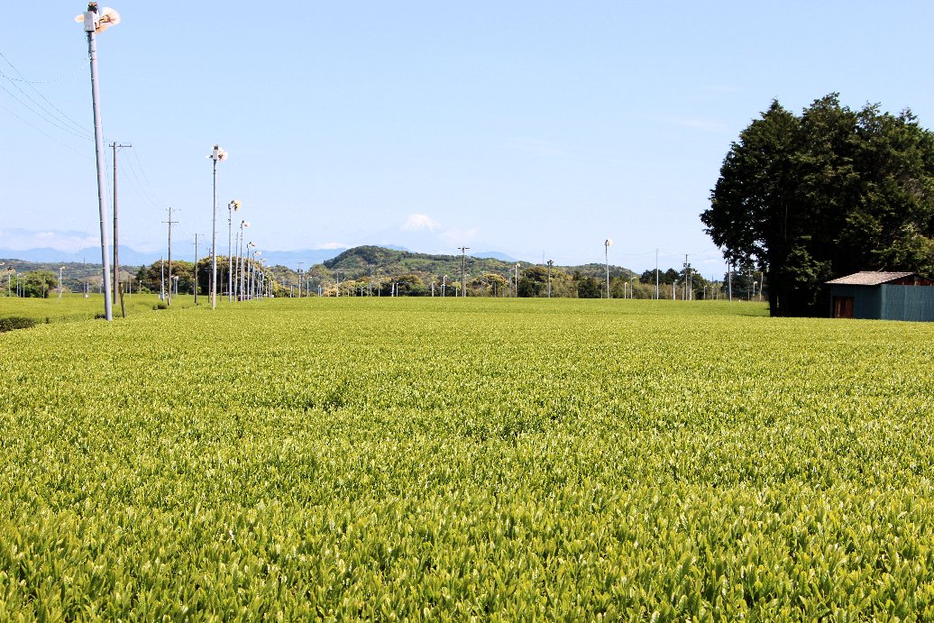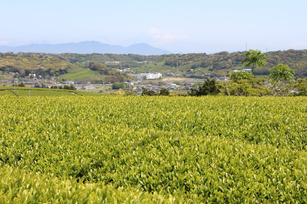 4月下旬から初夏、牧之原台地は、見渡す限りの茶畑が新芽の緑に覆われ、夏に向かう空の青、遠くには富士山と伊豆の山が見渡せ、見おろす海の青とのコントラストが最高の景色になります。